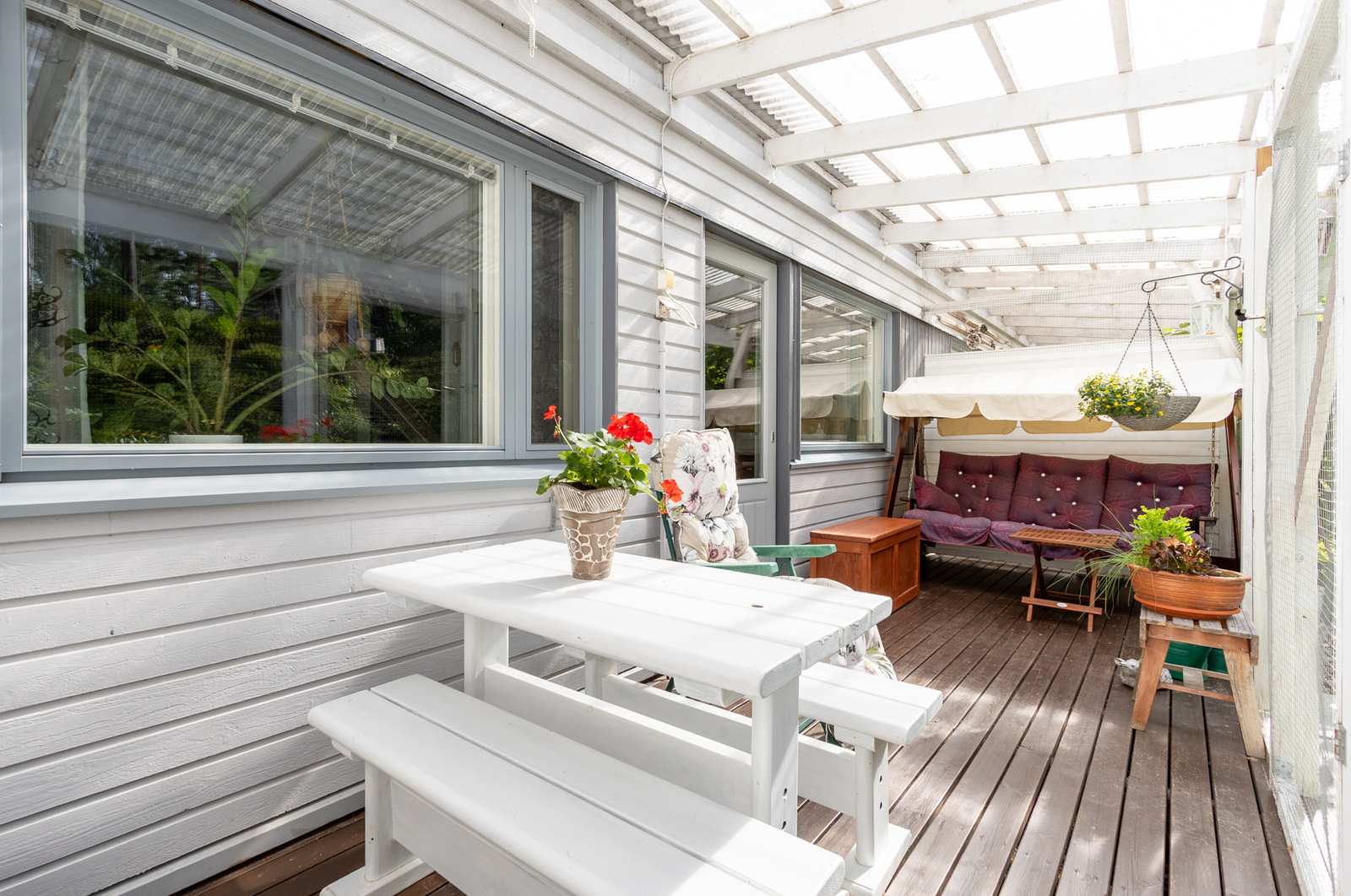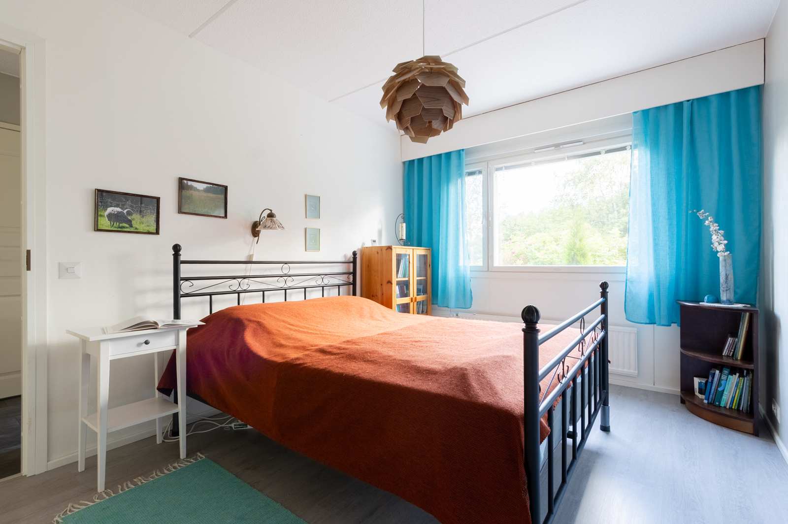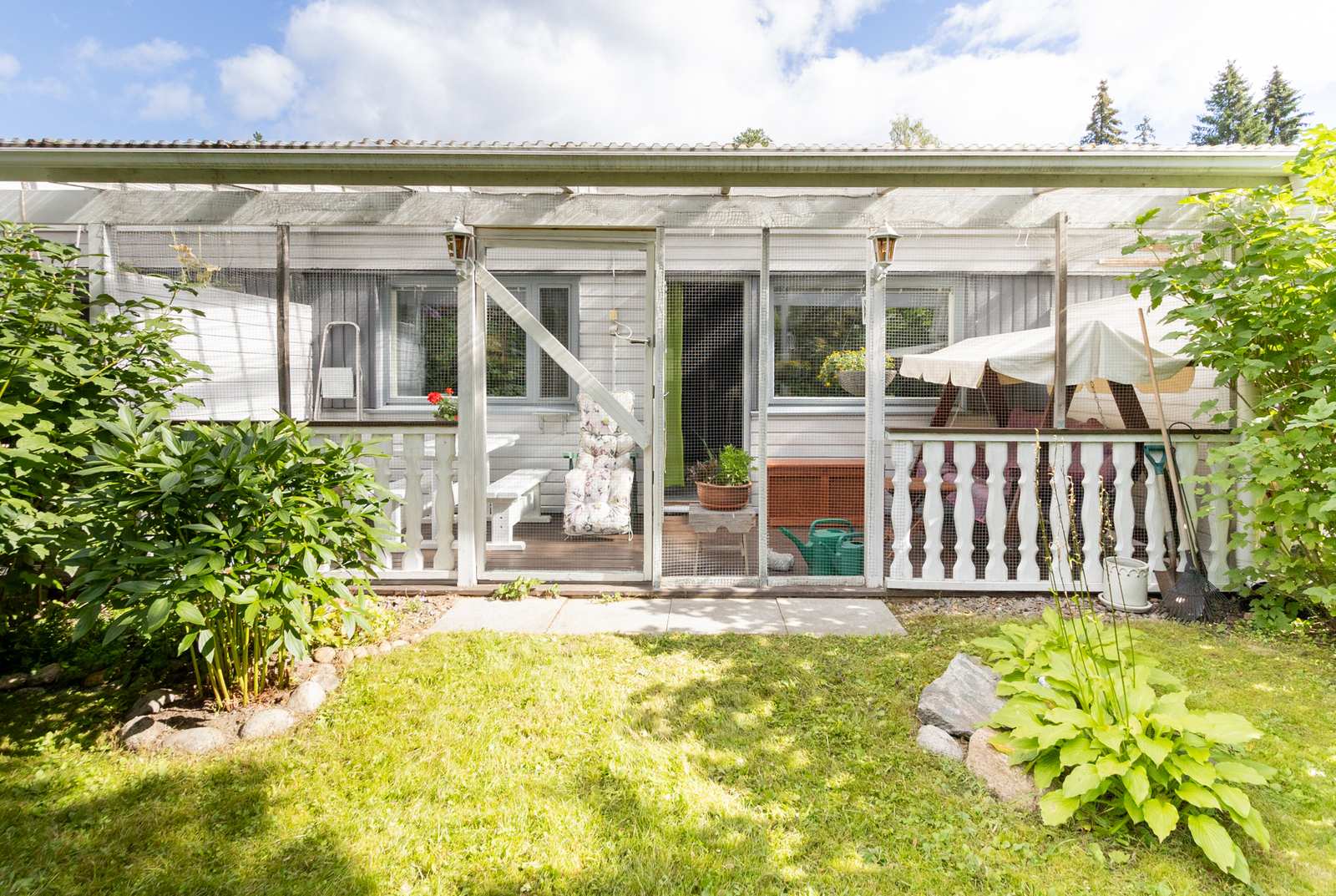 Vähäjärven virkistysreittien välittömässä läheisyydessä avarapohjainen 1-tasoinen rivitalokaksio! Hyvänkokoinen makuuhuone, jonka yhteydessä vaatehuone. Keittiötä, kylpyhuonetta sekä pintoja on uudistettu vuosien varrella. Olohuone myös tilava, josta käynti vehreälle takapihalle. Takapihalla asunnon levyinen katettu terassi, nurmialuetta sekä istutusrinne.