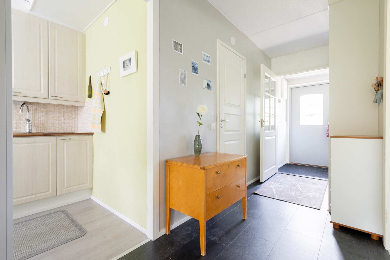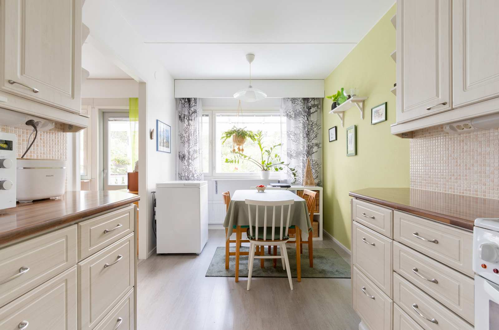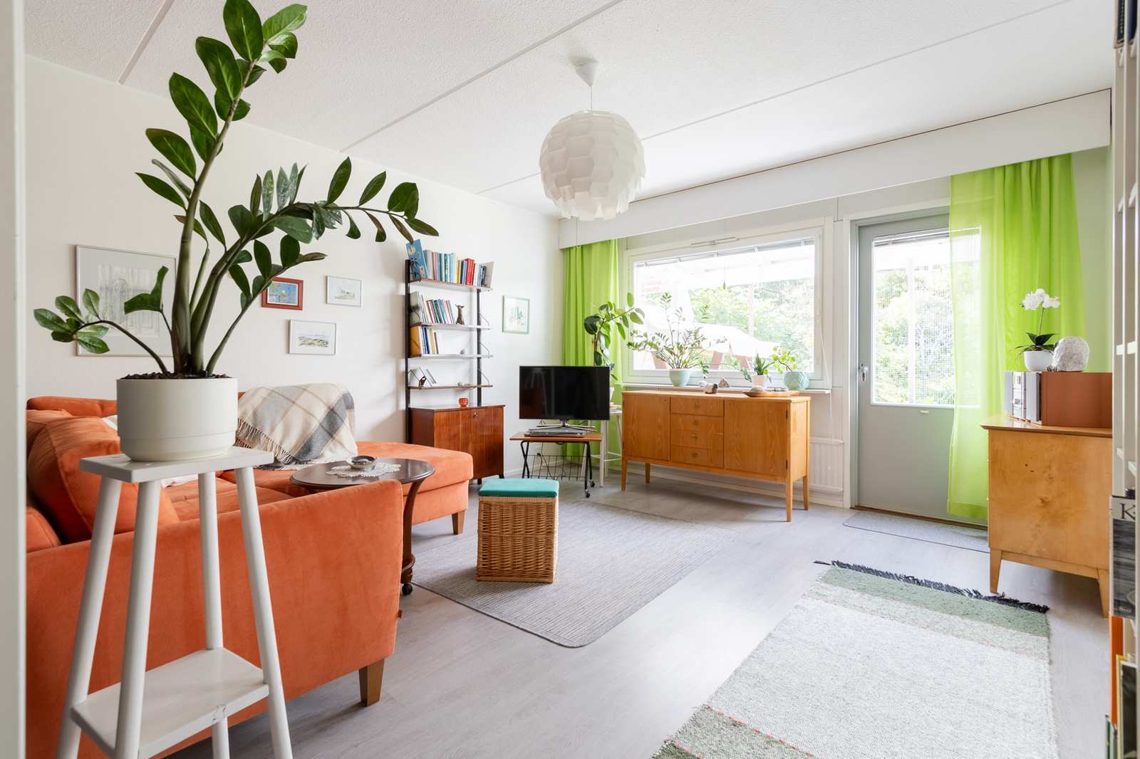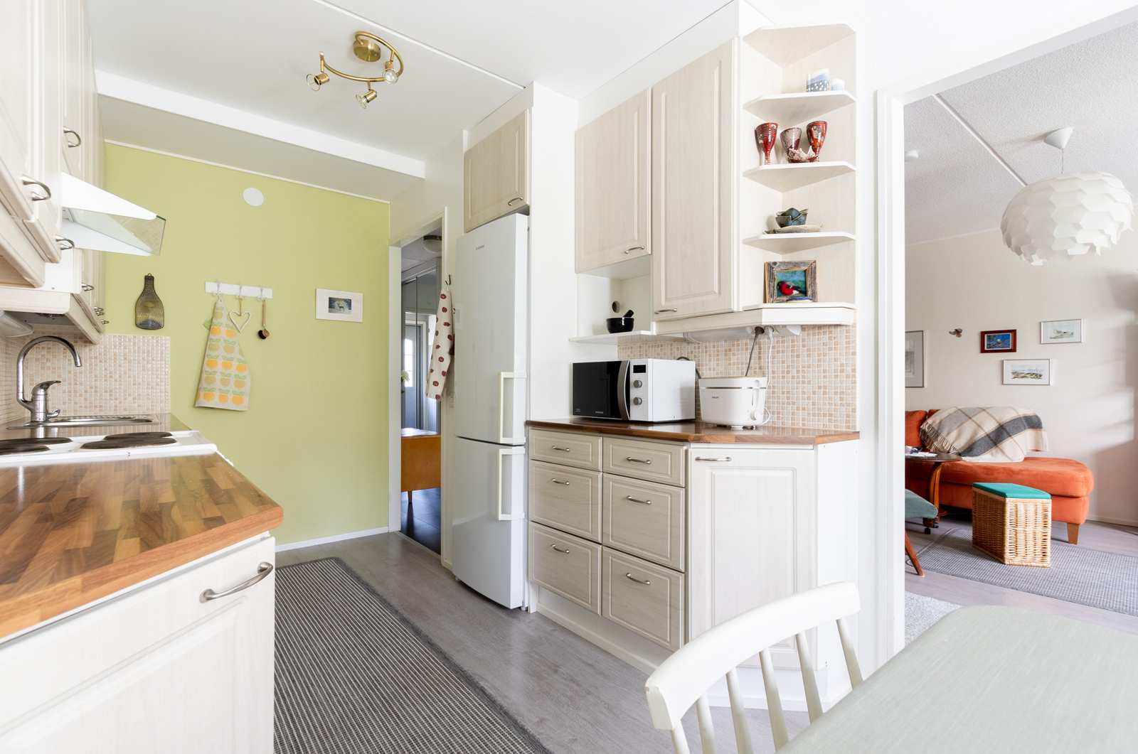 Vähäjärven virkistysreittien välittömässä läheisyydessä avarapohjainen 1-tasoinen rivitalokaksio! Hyvänkokoinen makuuhuone, jonka yhteydessä vaatehuone. Keittiötä, kylpyhuonetta sekä pintoja on uudistettu vuosien varrella. Olohuone myös tilava, josta käynti vehreälle takapihalle. Takapihalla asunnon levyinen katettu terassi, nurmialuetta sekä istutusrinne.