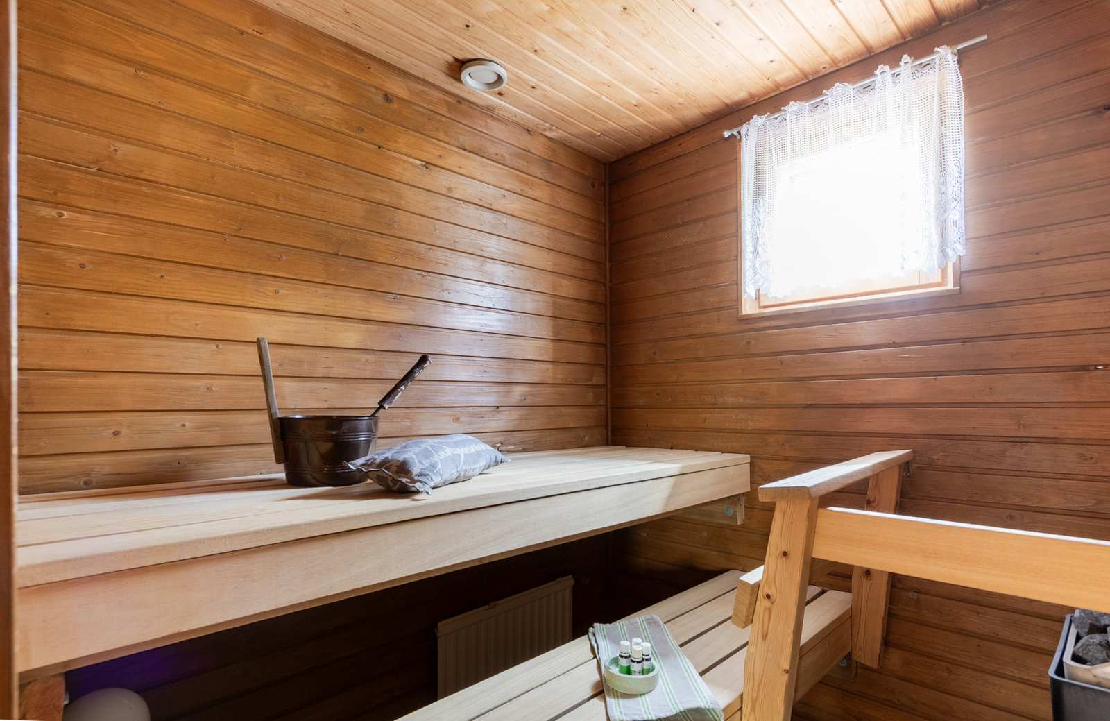 Saunan kuvaus | Saunassa sähkökiuas, lauteet, paneloitu, ikkuna. |