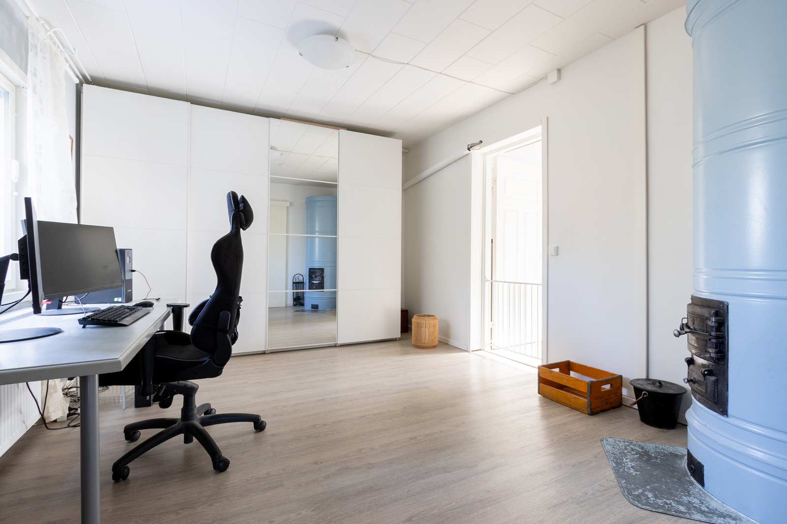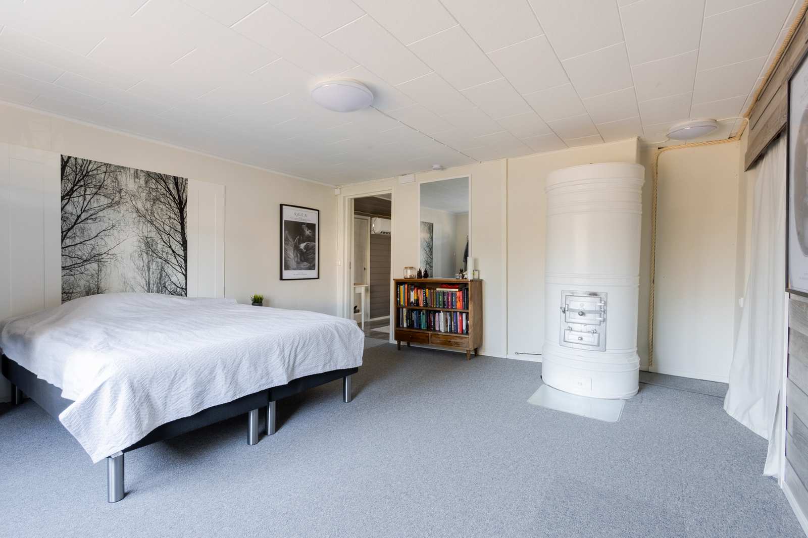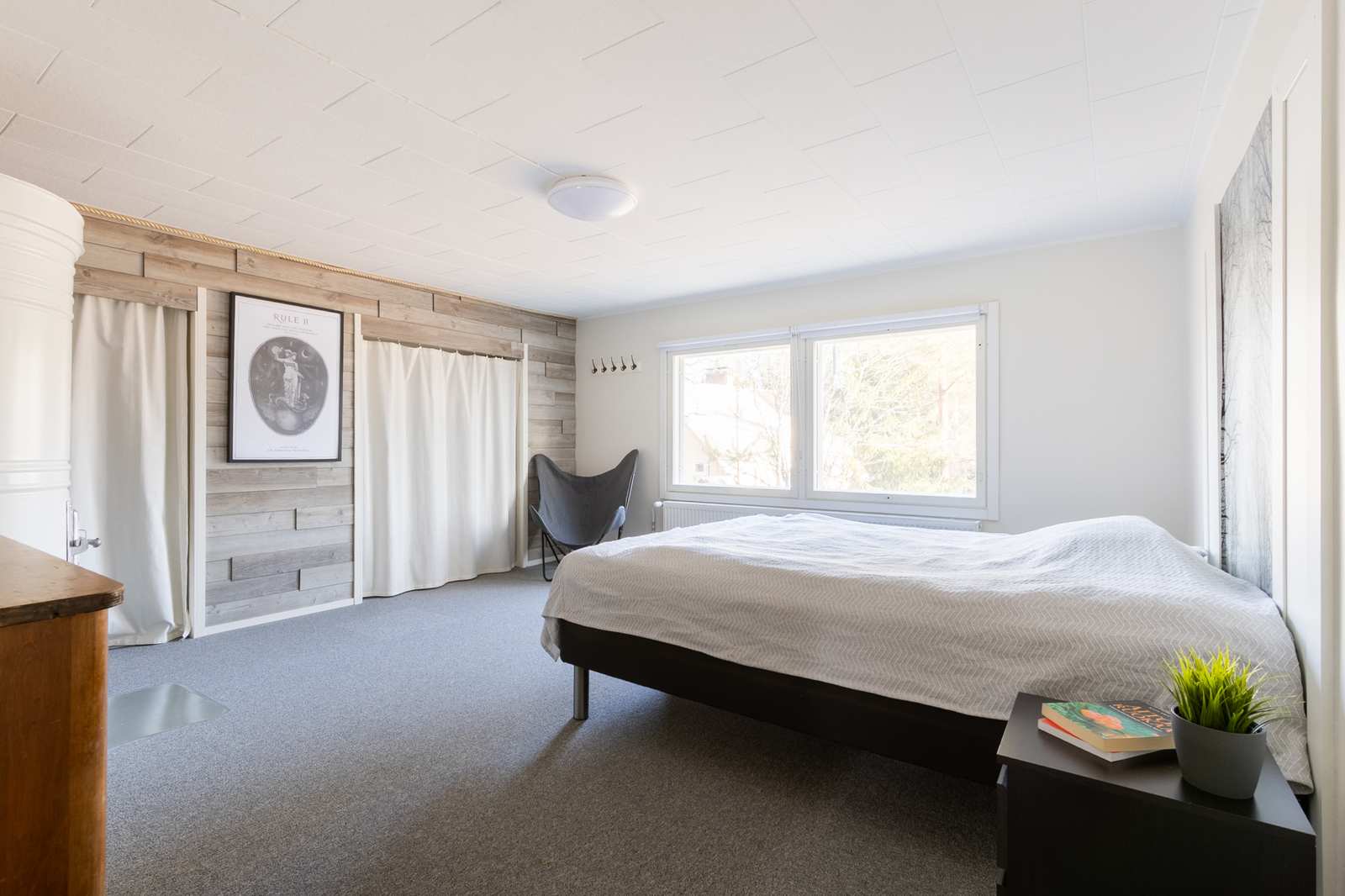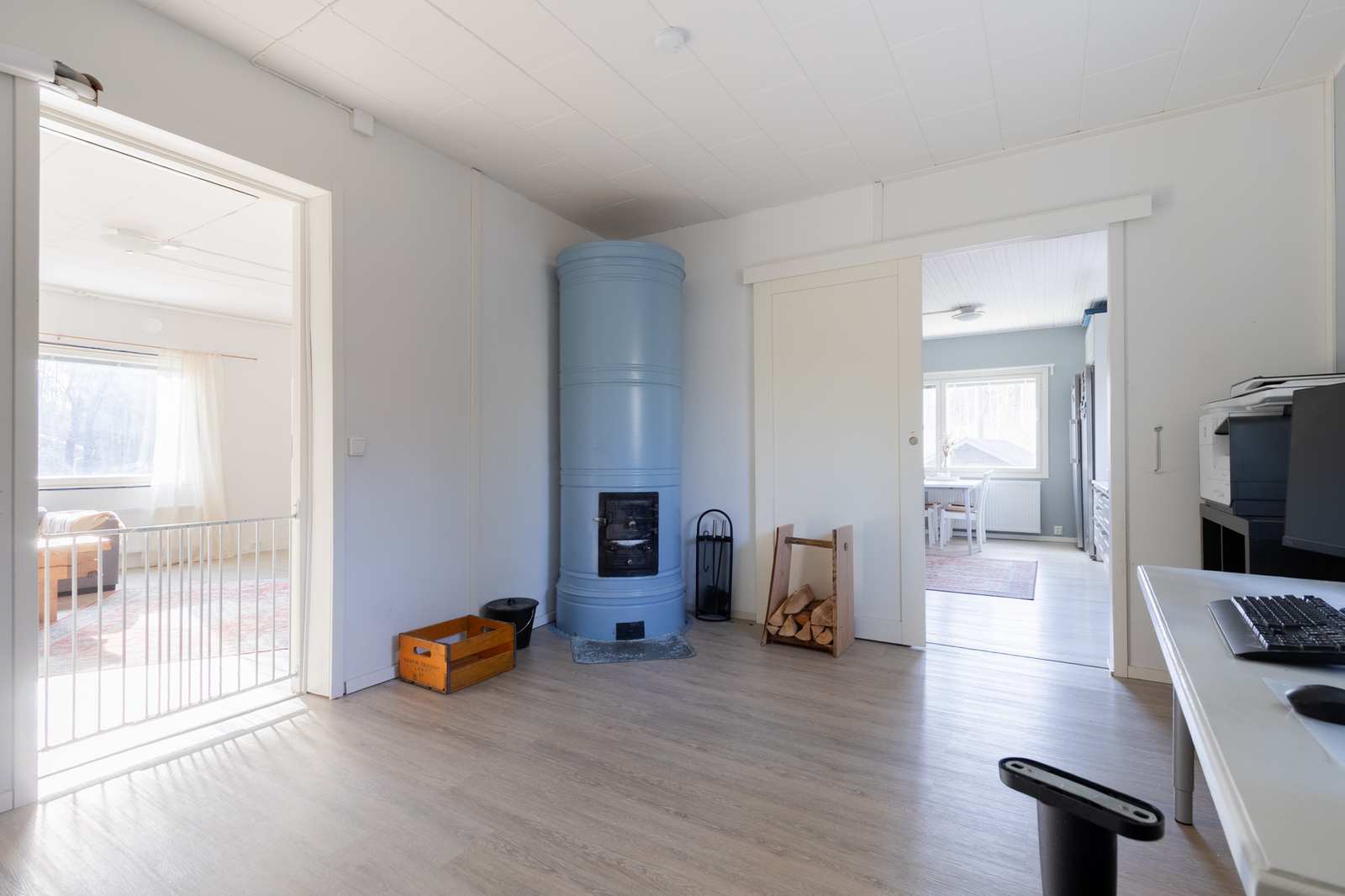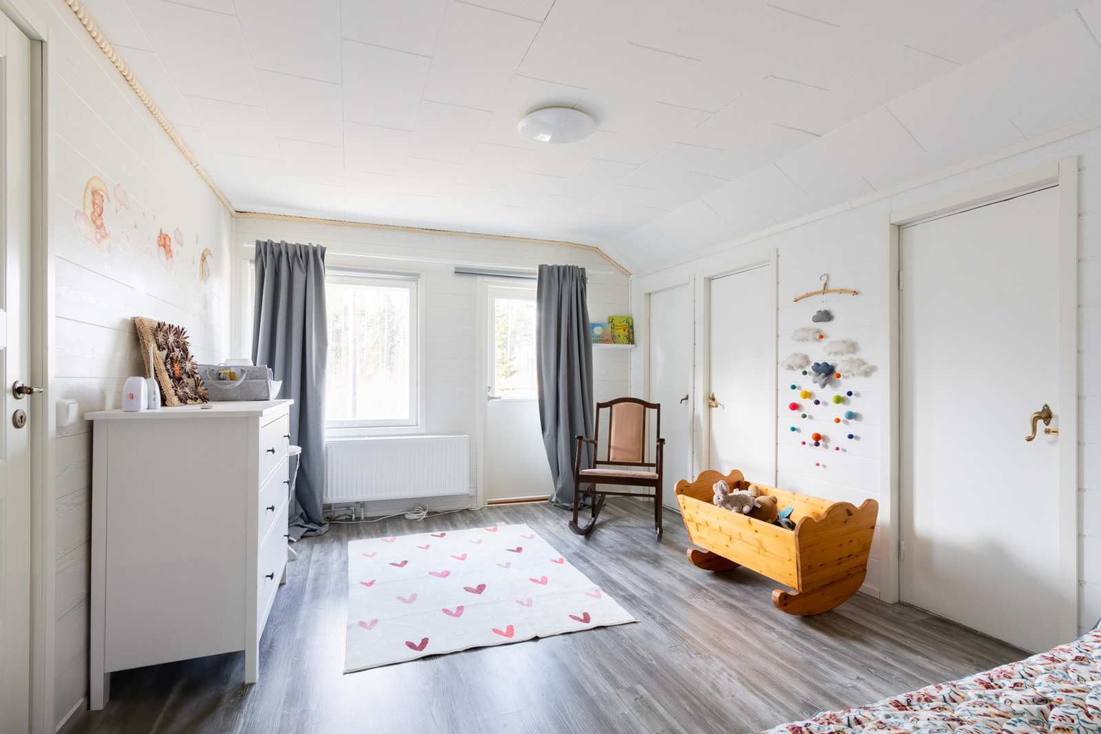 | Makuuhuone | Alakerran huoneessa pönttöuuni, lattiat vinyyliä, seinät maalipinta. Yläkerran makuuhuoneissa lattiat laminaattia (toisessa huoneessa kokolattiamatto päällä), seinät maali / paneeli, komeroita ja vintti / säilytystiloja, toisessa makuuhuoneessa pönttöuuni. |