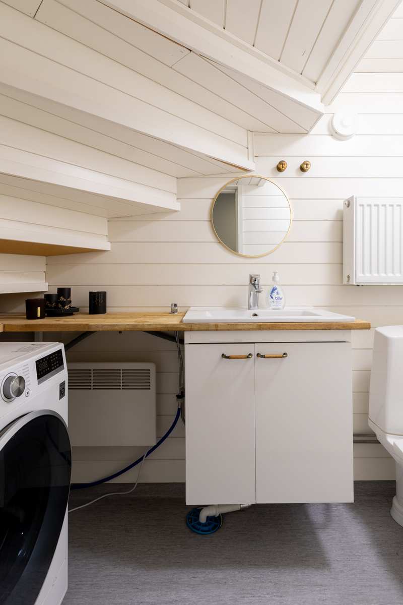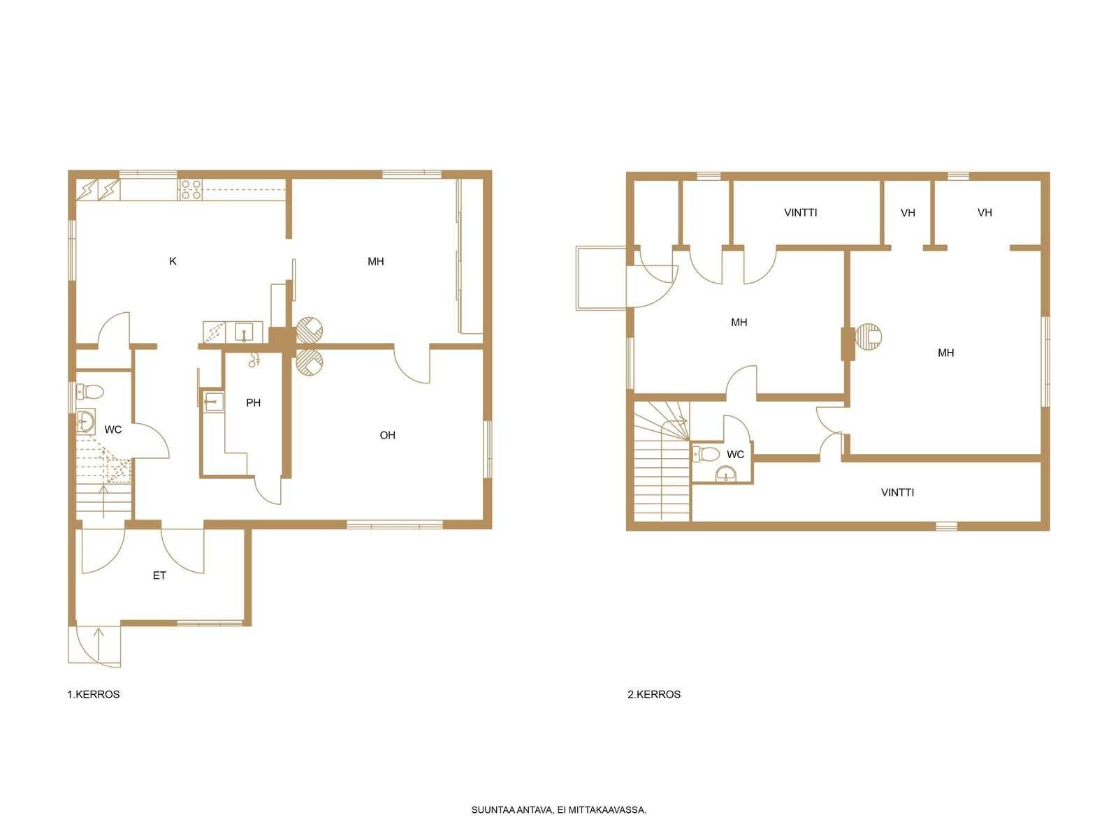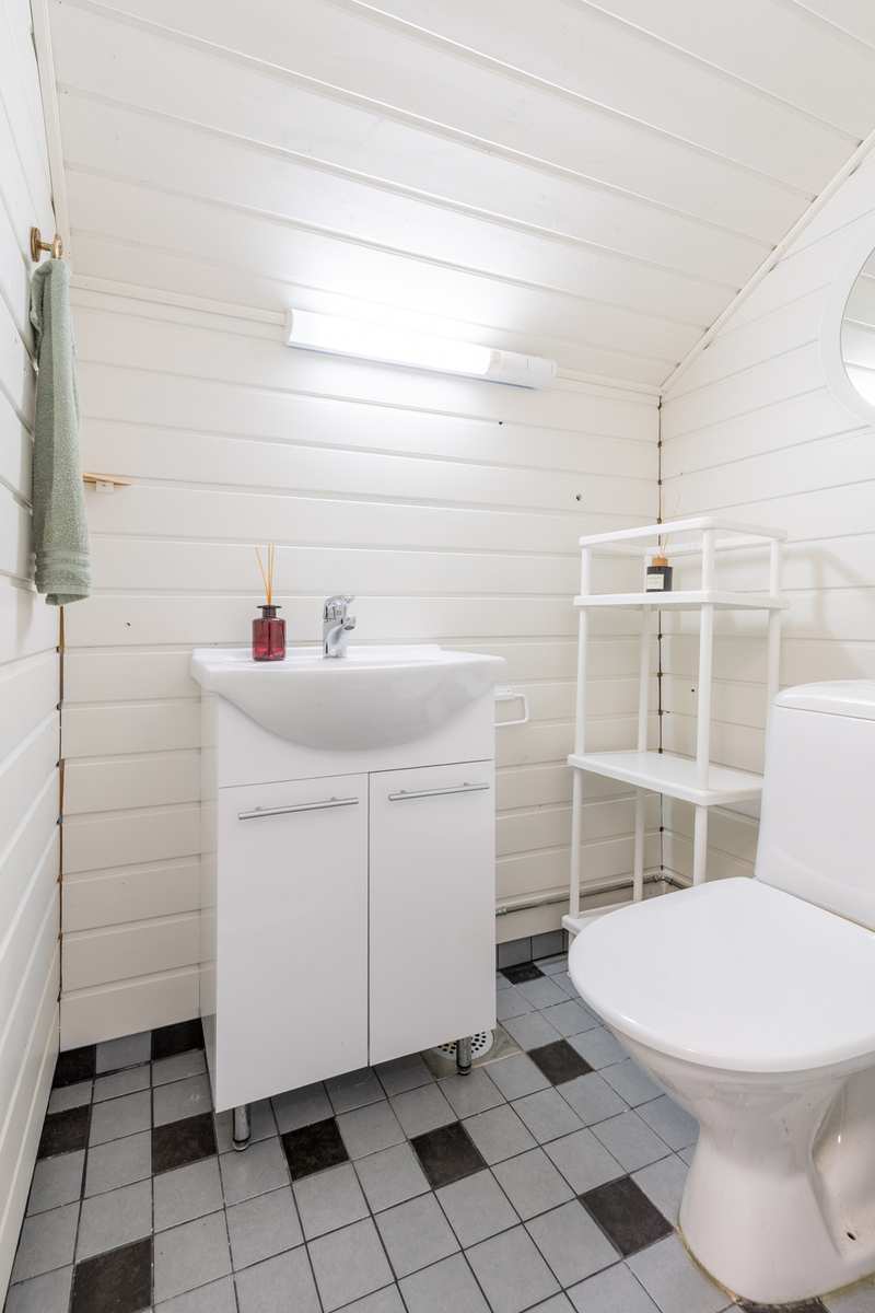 | Erillinen WC | Wc: ssä wc-istuin, allas, kaappi, pk-liitäntä, seinät paneeli, muovimatto. Yläkerran wc: wc-istuin, allaskaappi, peili, seinät paneeli, laattalattia. |