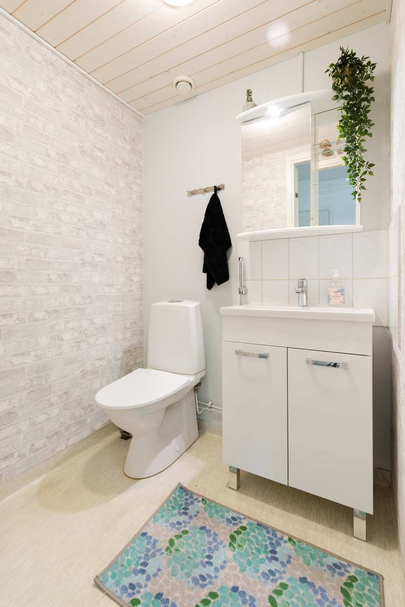 | Erillinen WC | Wc:ssä wc-istuin, allaskaappi, peilikaappi, muovimatto, seinät tapetti. |