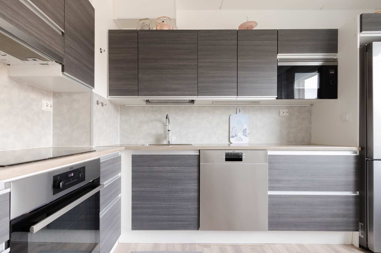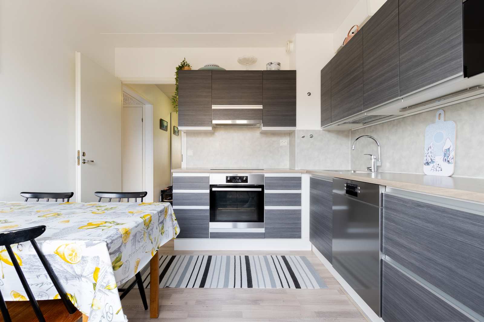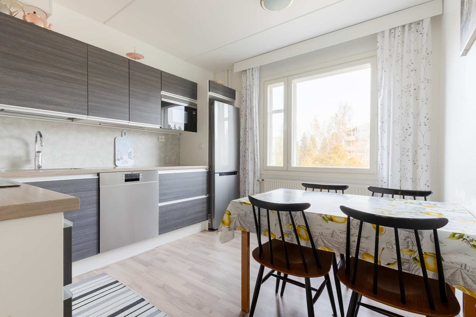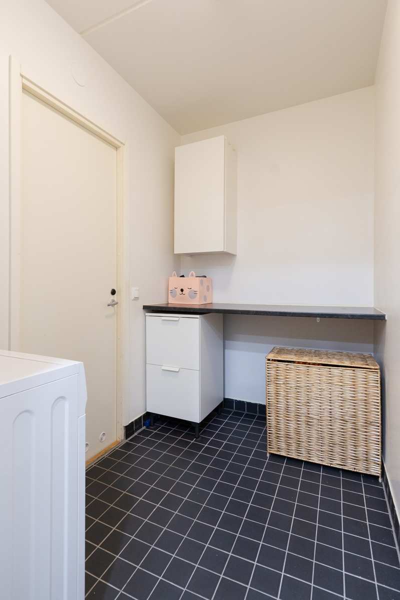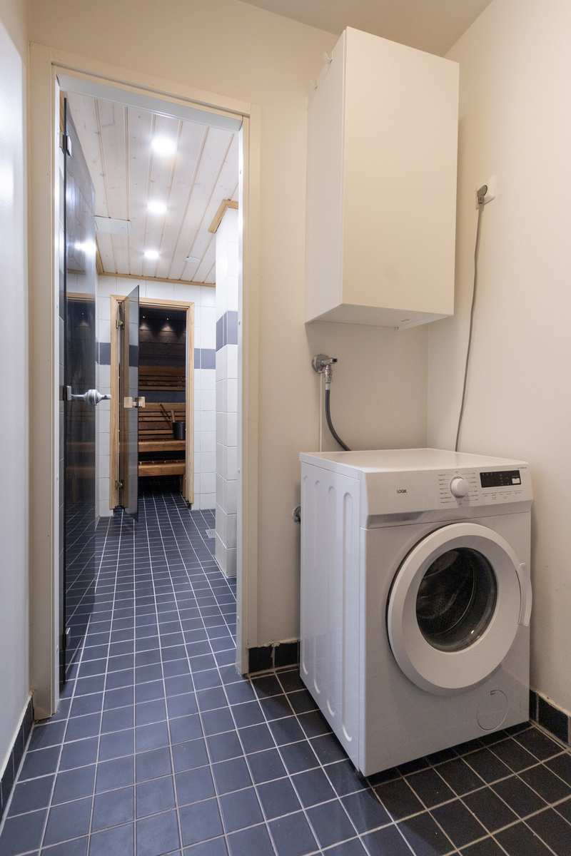 | Kodinhoitohuone | Kylpyhuoneen yhteydessä kodinhoitotila: kaapistot, pk-liitäntä, laattalattia. |