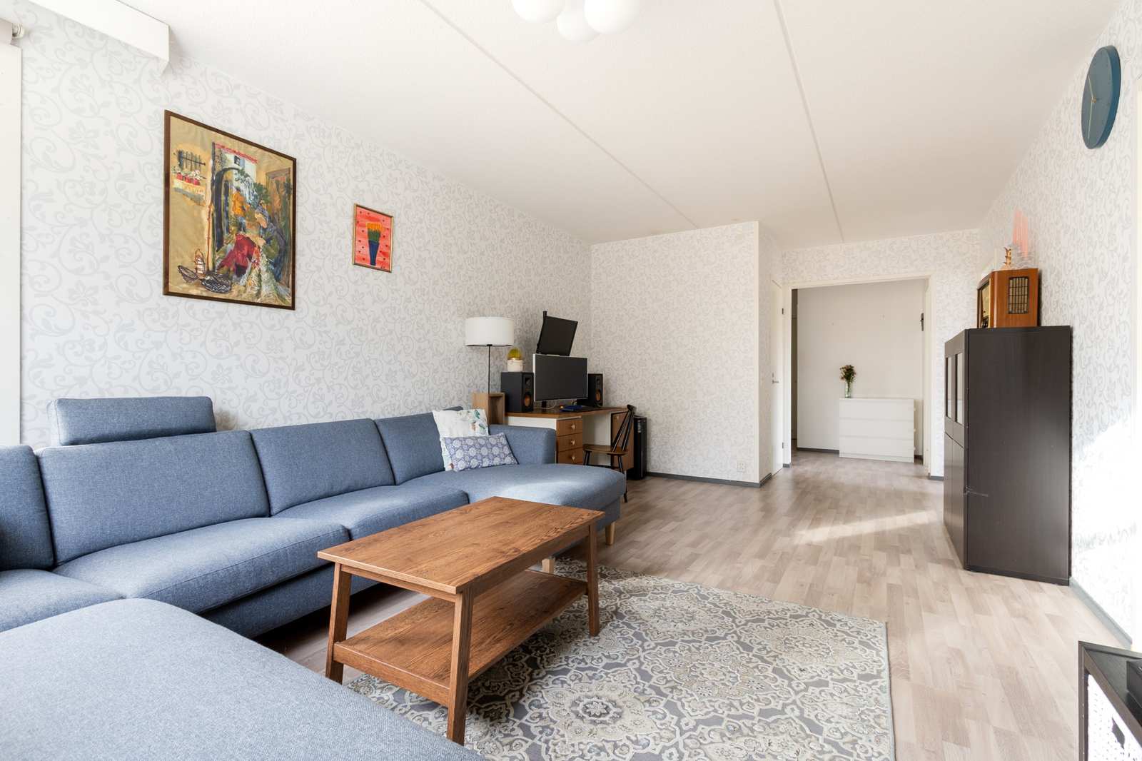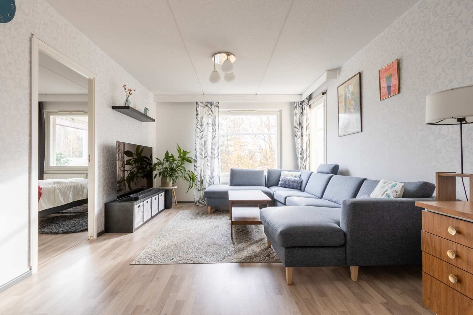 | Olohuone | Olohuoneessa lattia laminaattia, seinät tapetti. |