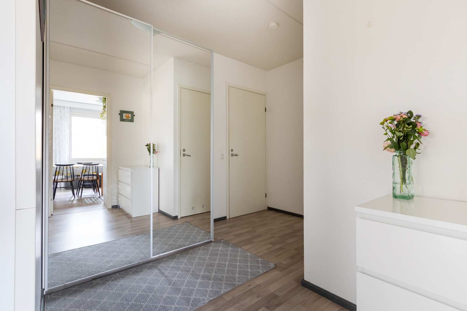 | Tilojen kuvaus | Eteisessä lattia laminaattia, liukuovikaapit. |